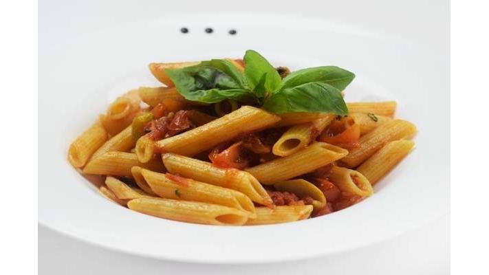 Penne, roșii cherry, ciuperci, busuioc, pătrunjel, dovlecel, vinete, sos roșu, sare, piper 400g