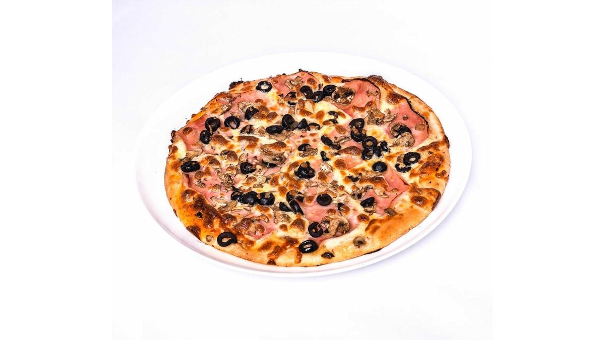 Sos roșii, mozzarella, șuncă presată, ciuperci, ardei, măsline, ardei iute, oregano