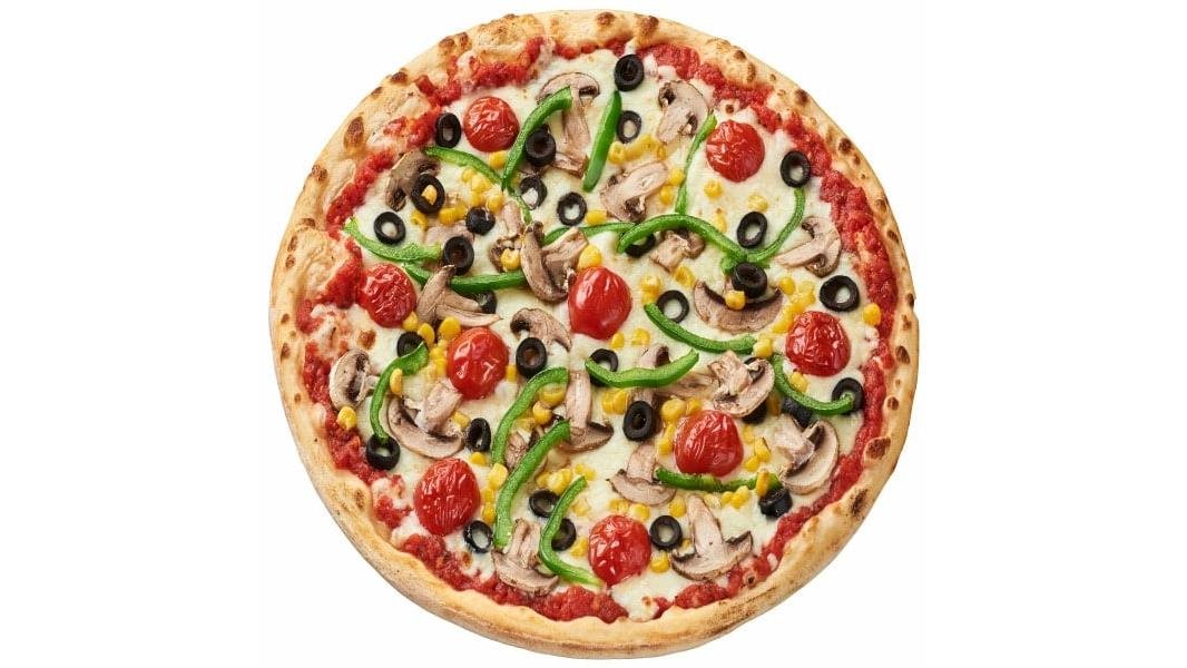 Sos roșii, cașcaval vegetal, ciuperci, ardei, măsline, porumb, roșii, vânătă, dovlecel