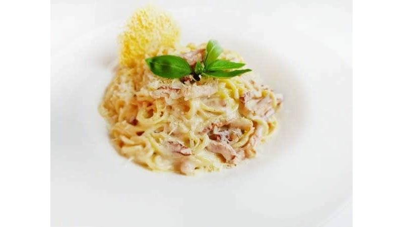 Spaghetti, ou, smântână, parmezan, bacon, sare, piper 400g
