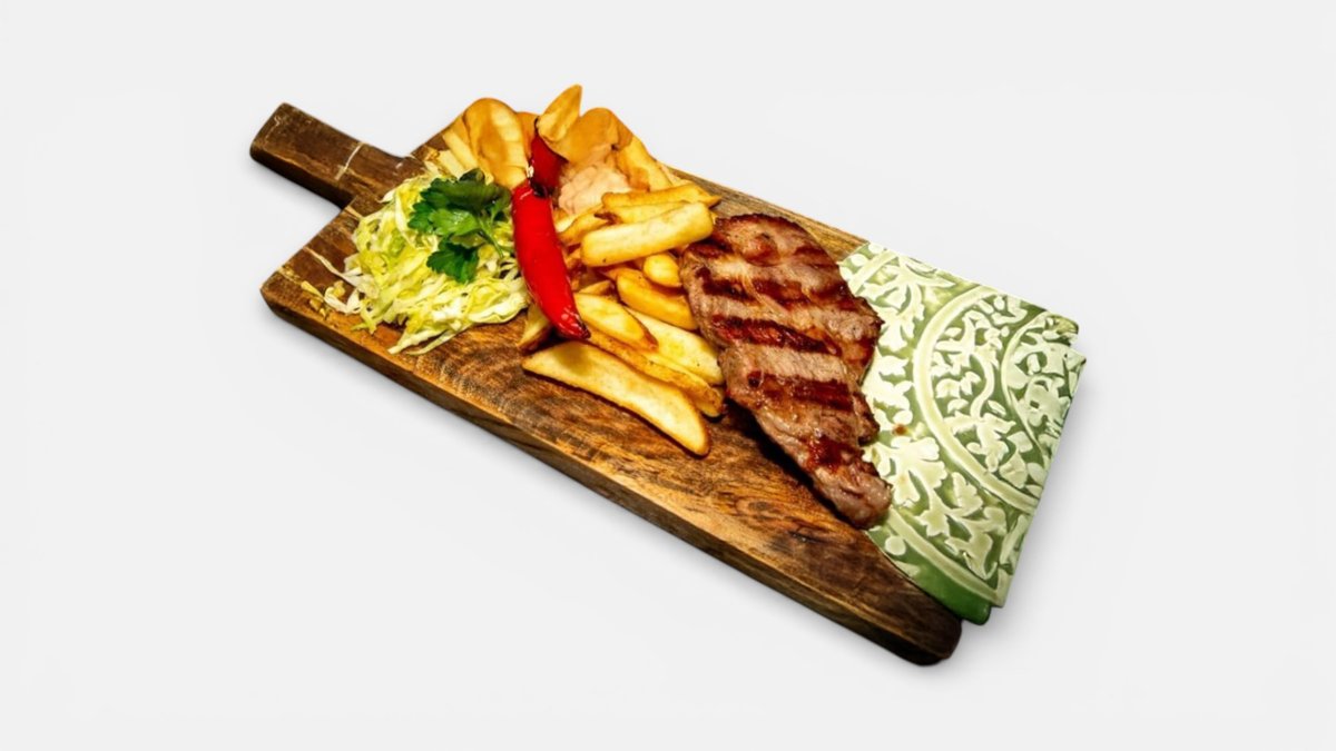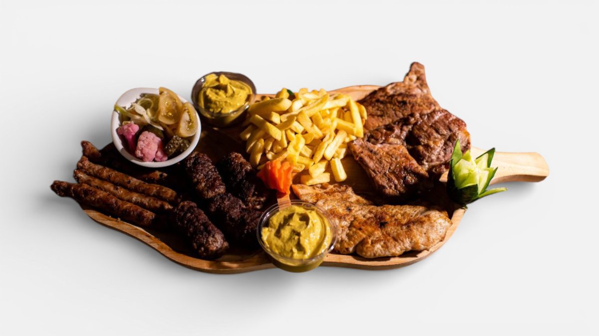 cefa de porc/mici/pulpa de pui/bacon/carnaciori/telemea/ardel iute/ceapa/muraturi/cartofi taranesti/ pita