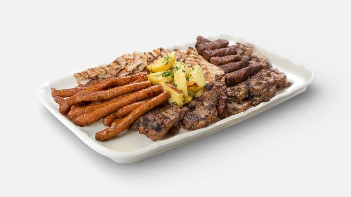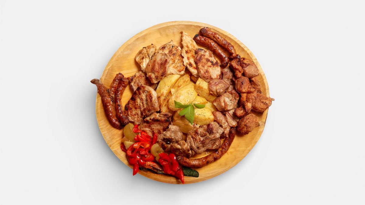 pulpa de pui/cotlet de porc/mici/carnaciori/coaste/cartofi rondele/muraturi/pita