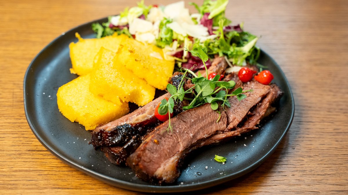 Brisket 100 g, ouă 140 g, boia, sare, piper, microplante, pătrunjel, ulei de măsline, focaccia, sos bbq 50 g (zahăr, boia, werchester, ketchup, coca-cola), roșii - 340g