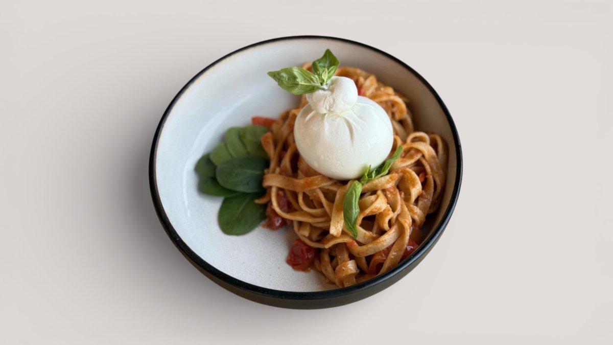 Tagliatelle cu roșii proaspete, pesto și burrata