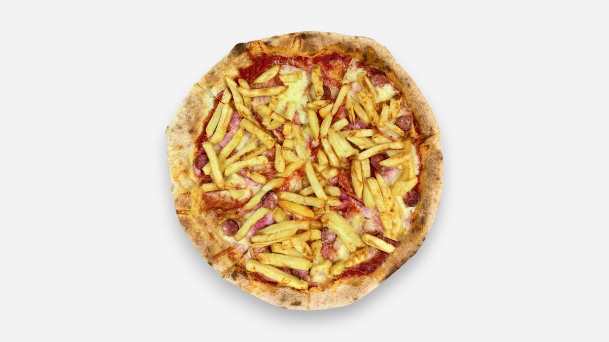 Aluat, sos de roșii, mozzarella, șuncă, salam picant, cabanos, cartofi pai 590 g