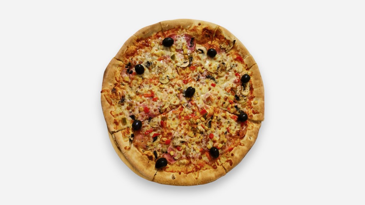 Aluat, sos de roșii, mozzarella, șuncă, ciuperci, porumb, măsline 600 g