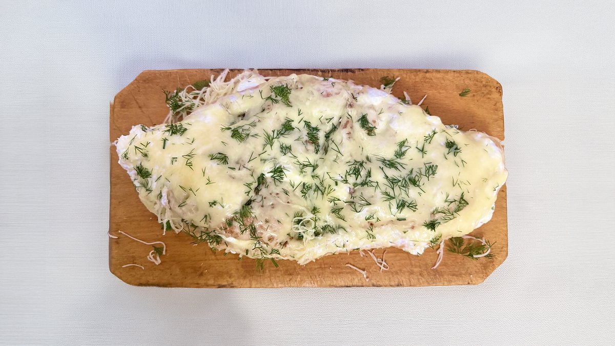 Aluat, piept de pui, șuncă, ciuperci, smântână, sos alb, cașcaval, mărar 620 g
