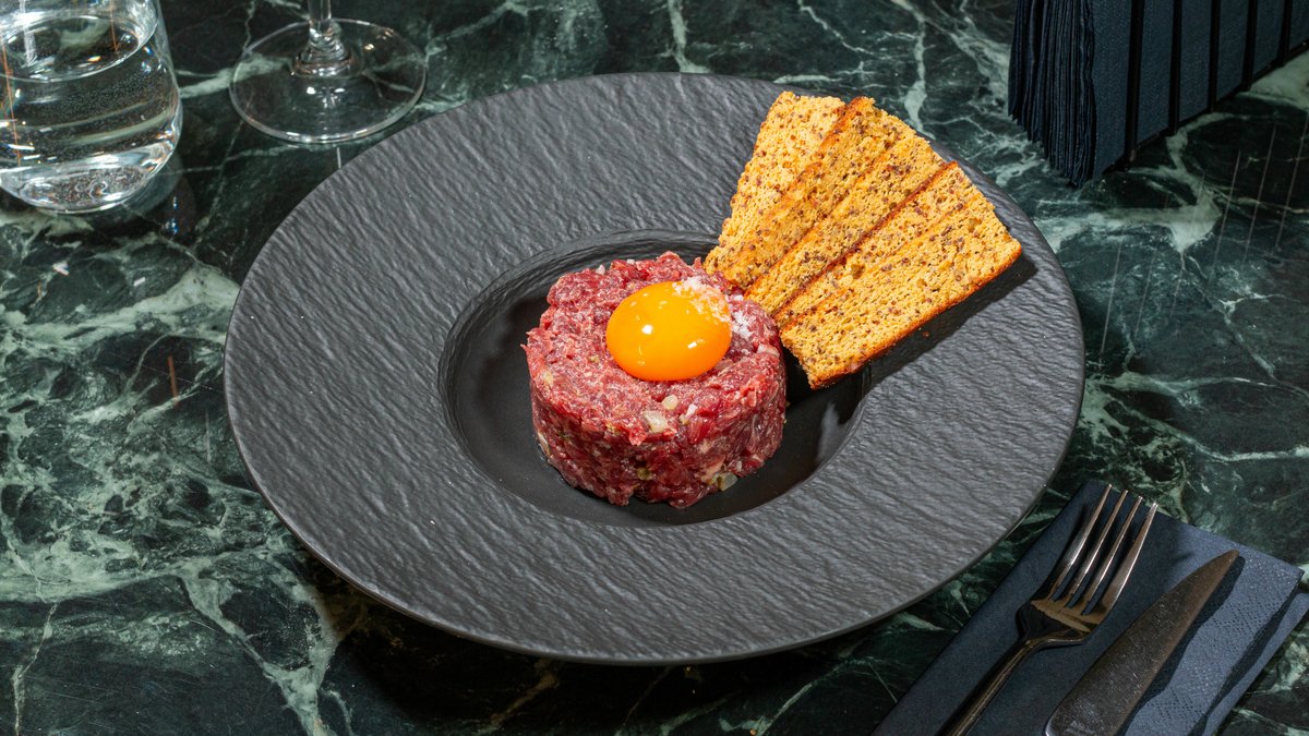 Mușchi de vită, capere, ceapă, castravete murat, gălbenuș de ou, soia, făină de migdale, muștar, lapte, ulei de măsline Beef Tartare: beef sirloin, capers, onion, pickles, egg yolk, soy, almond flour, mustard, milk, olive oil 200gr