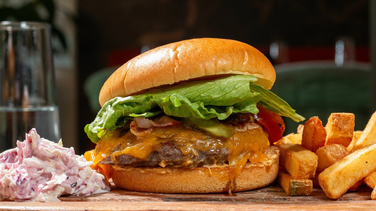 Carne de vită, sos burger, brânză cheddar, roșii, salată, castraveți murați, ceapă caramelizată, bacon, chiă brioche, carto prăjiți, salată coleslaw 500 gr