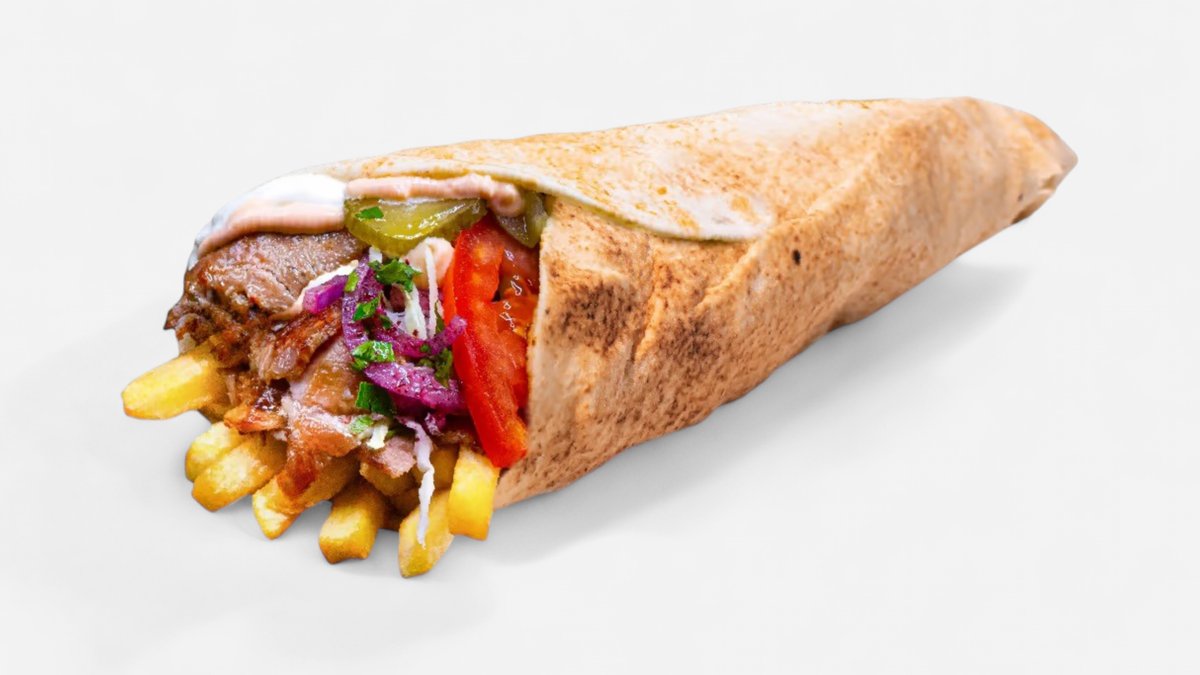Donner de curcan și vițel, cartofi prăjiți, salată de varză, roșii, salată de ceapă roșie, pătrunjel și sumac, lipie, castraveți în saramură și 2 sosuri la alegere – 430g