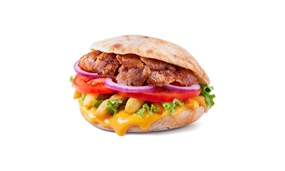 Panini, carne kebab rotisată (curcan și vițel amestec), cartofi prăjiți, sos alb, salată verde, roșii, ceapă roșie,. 230gr.
