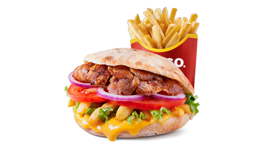 Cartofi prăjiți, carne kebab rotisată (curcan și vițel amestec), panini, sos alb, salată de varză, salată verde, roșii, ceapă roșie, pătrunjel 430 g