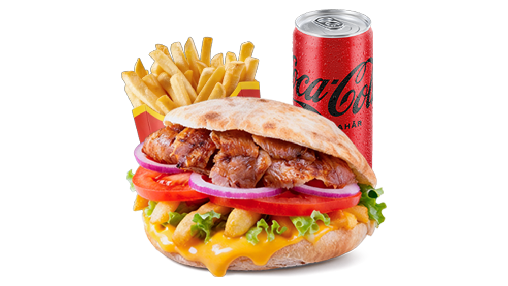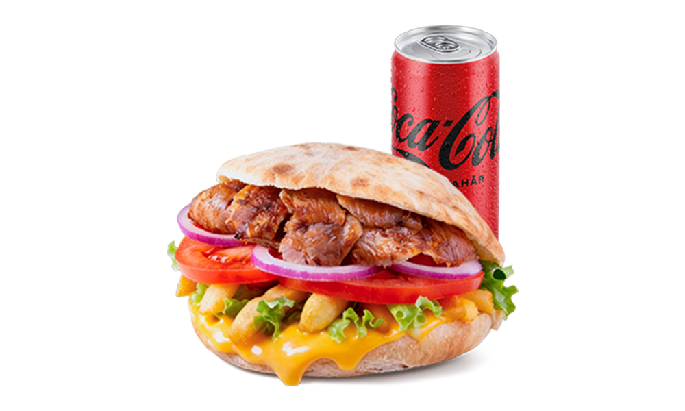 Panini, carne kebab rotisată (curcan și vițel amestec), sos alb, salată verde, roșii, ceapă roșie - 230g, cartofi prăjiti 130gr si o Coca-Cola 330ml. Băutura conține garanție SGR.