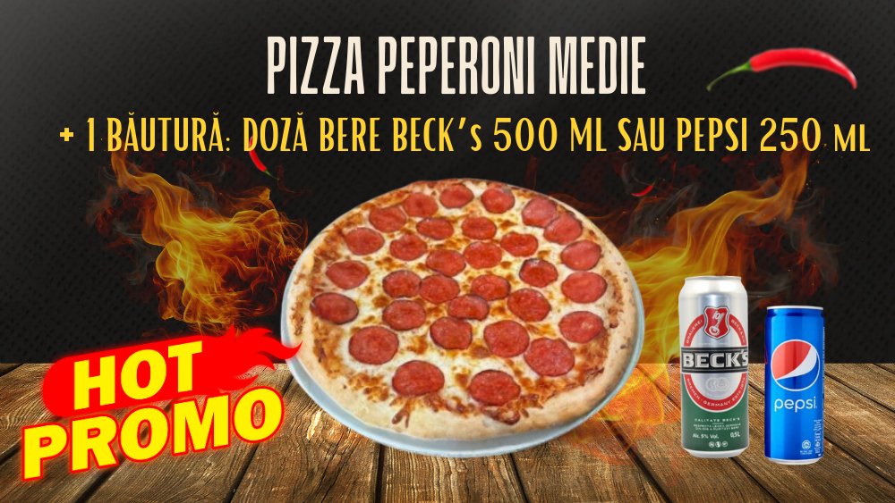 Pizza Pepperoni medie+bautura(doza Bergenbier sau Cola Pet 0.3L)