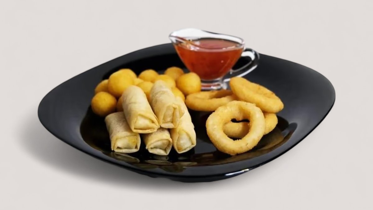 pachetele de primavara, bulete de cartofi, inele de ceapa pane, sos sweet chilli (produs de post)