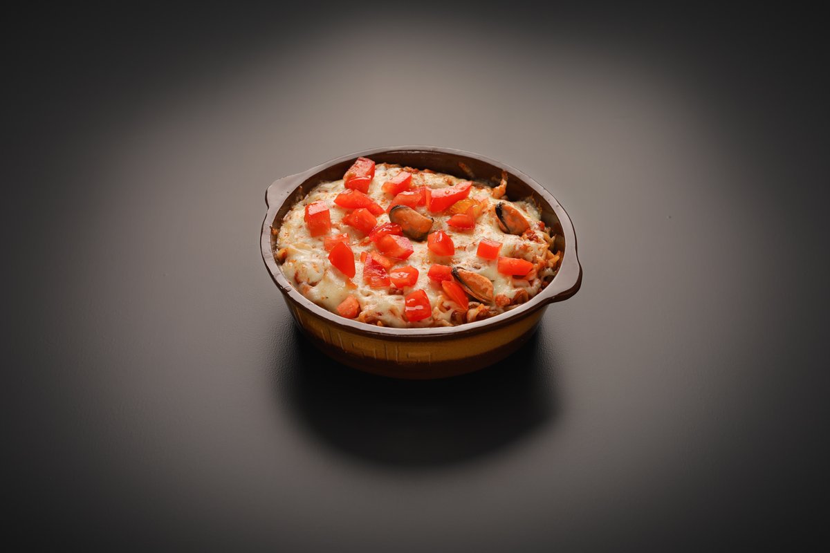 400g Spaghete, sos pizza,cockteil de fructe de mare*, usturoi granule, roșii, topping pizza