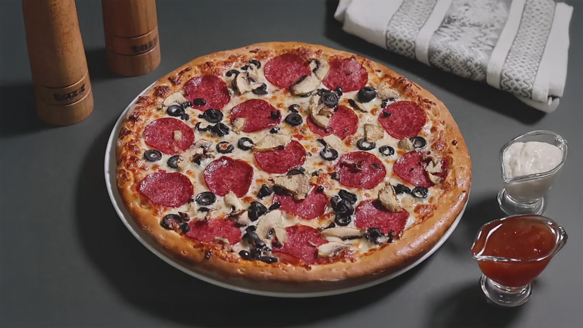540g/1180g/1850g, Blat, sos pizza, salam pizza crud-uscat, ciuperci, masline, topping pizza