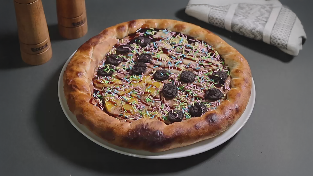 700gr, 30cm, Blat cu margine umpluta cu ciocolata Finetti, crema de ciocolata(crema de branza, ciocolata Finetti), portocale, banane, biscuiti Oreo, betisoare colorate din zahar, topping de ciocolata alba sau neagra