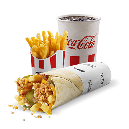 3 Crispy Strips® 90g, 4 Hot Wings® 100g, 1 porție mare de cartofi prăjiți 120g, 1 băutură răcoritoare 0,5L