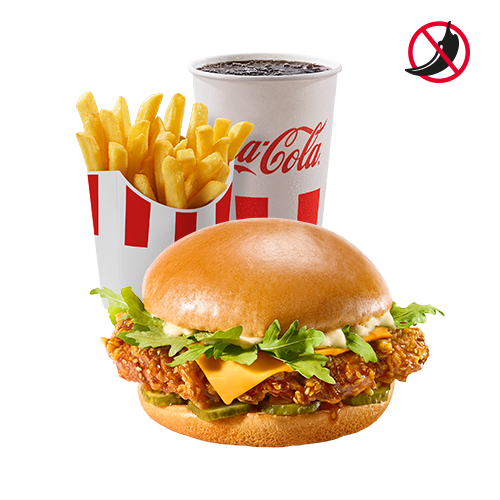Cheezy Burger nepicant (220G), 1 portie mare de cartofi prajiti (120g), 1 racoritoare la pahar (0.5L)