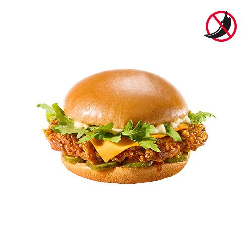 Piept de pui nepicant, sos cald cu branza, branza Cheddar, bacon, castraveti murati, ceapa caramelizata, sos barbecue, chifla Brioche (220g)