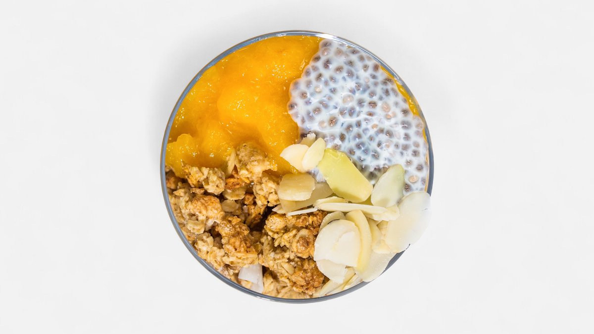 Budincă de chia(lapte de soia (Bază de soia 98% (apă, boabe de soia 7.1%), zahăr, carbonat de calciu, sare, arome naturale, vitamina D, vitamina B12) 83%, semințe de chia 12.5%, miere 4%) 100g, compot piersici (piersici galbene, apă, zahăr, acidifiant (acid citric), vitamina C) 60g, musli crunch original (Fulgi de ovăz integral, zahăr, ulei de palmier, fugi de gâu integral, extrudat de orez (făină de orez, zahăr, gluten din grâu, malț din orz și grâu, sare, extract din malț din orz, emulgator-lecitină din floarea soarelui), nucăde cocos, sirop de glucoză-fructoză, sirop de caramel, arome naturale. )30g, fulgi de migdale 10g VALORI NUTRITIONALE/100g PRODUS, KCAL 156.4 PROTEINE 4.9, LIPIDE 6.3, ACIZI GRAȘI SATURAȚI 1.5, CARBOHIDRAȚI 21.7, GLUCIDE 7.7, SARE 0.0, ALERGENI Cereale cu conținut de gluten, fructe cu coajă, arahide și produse derivate, soia și produse derivate