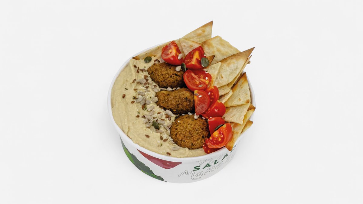 Hummus, falafel, chips lipie, roșii cherry, mix de semințe coapte 270 g Valori nutriționale / 100 g KCAL:206.3, PROTEINE:18.1 LIPIDE:4.8, CARBOHIDRAȚI:21.5, SARE:2.2