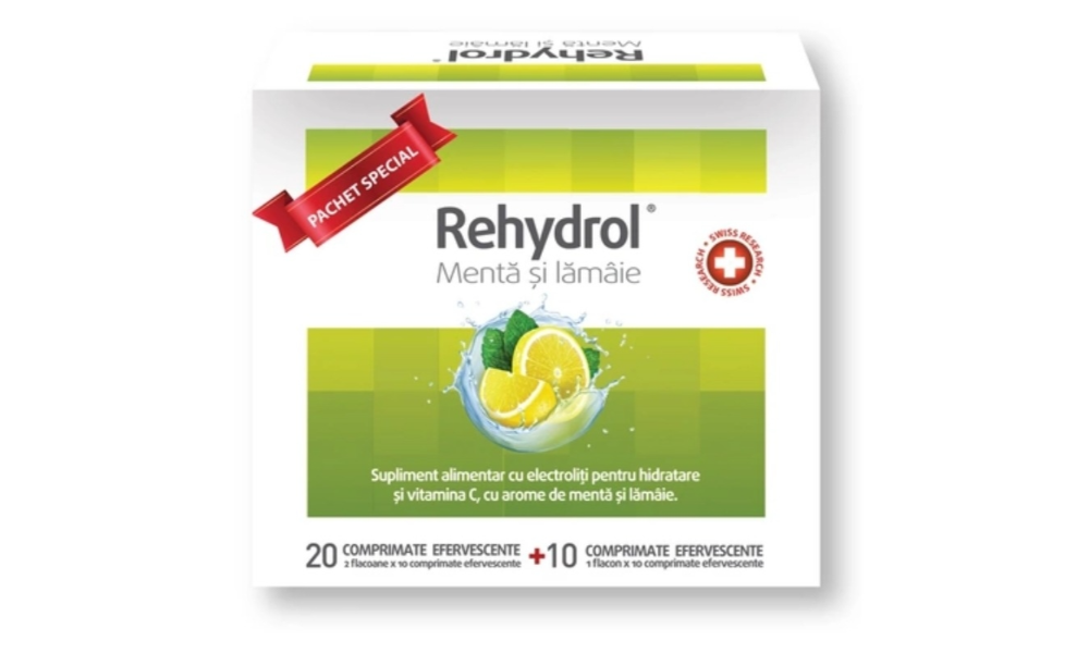Saruri de rehidratare cu menta si lamaie Rehydrol, 20 + 10 comprimate efervescente, MBA Pharma