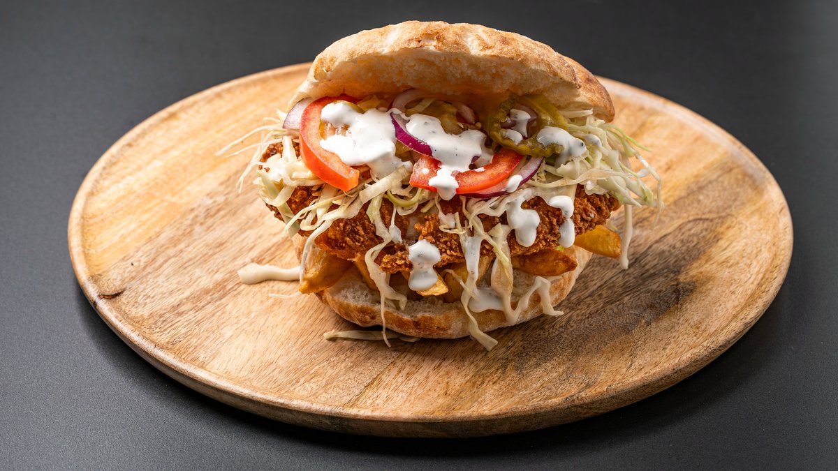 Lipie 70g, falafel 140g, cartofi 80g, roșii 20g, castraveți murați 20g, ceapa 20g, varza 50g, ardei iute 10g, sos maioneză cu usturoi 30g, sos ketchup 30g, sos tzatziki 30g, sos sambal 10g, sos doner 30g, sos antep 30g, sos tartar 30g 600 g