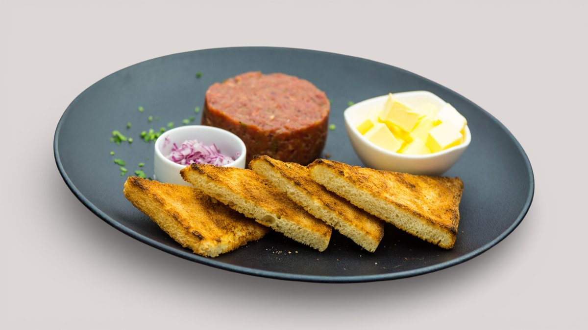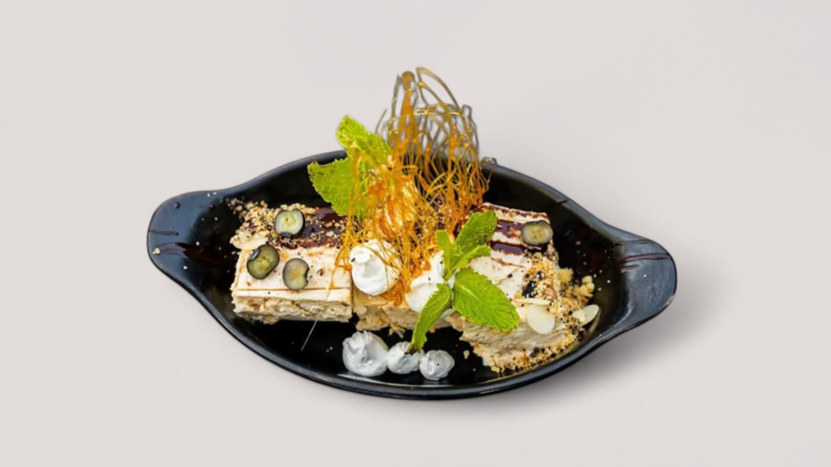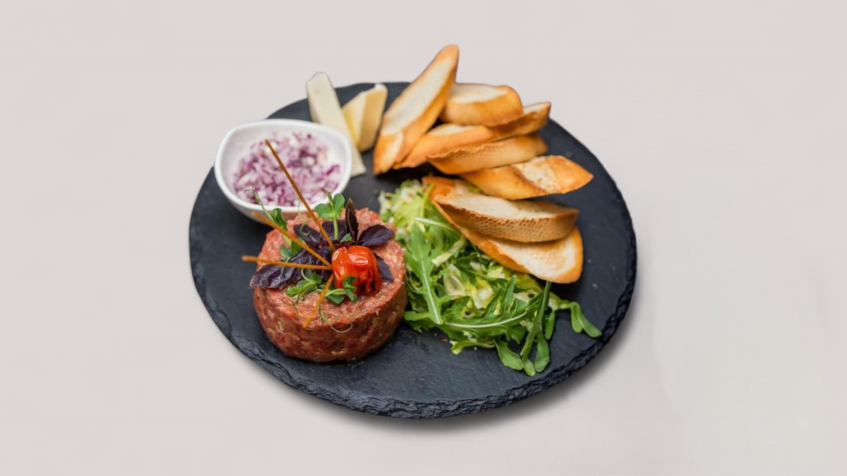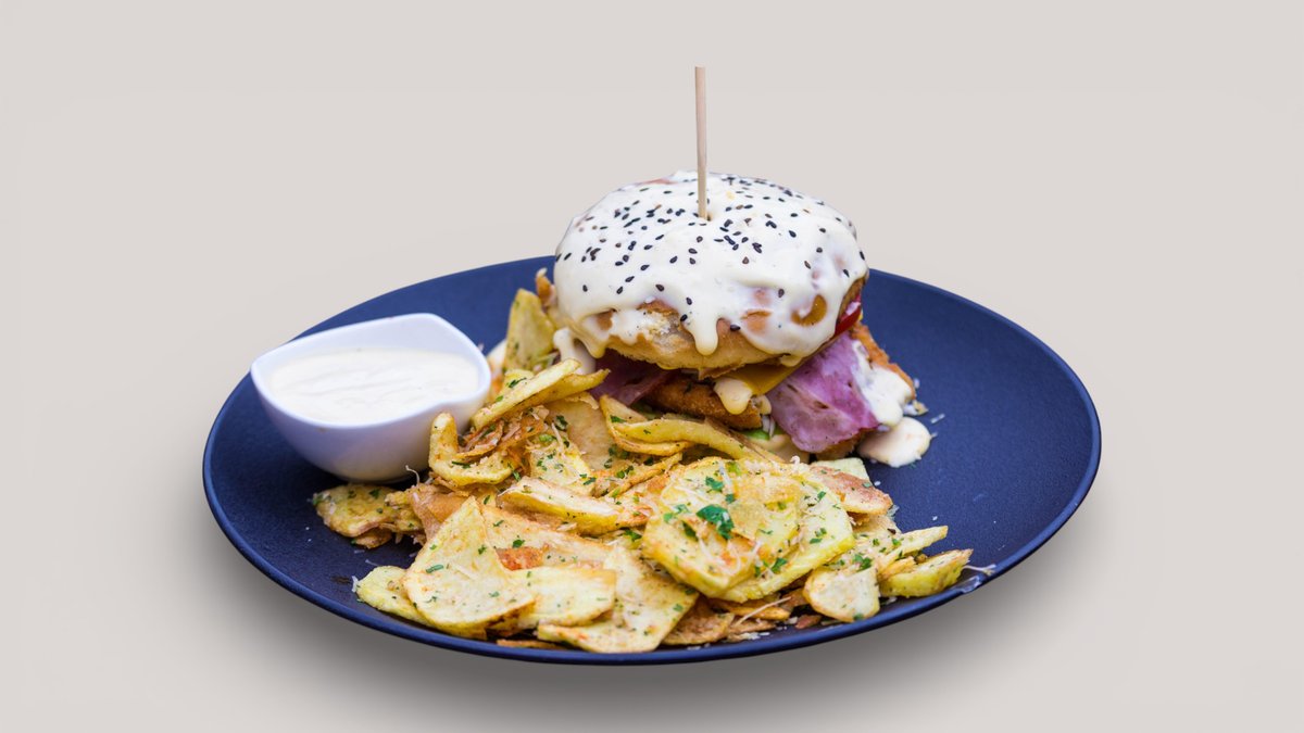 Carne de vită prăjită #smasher pe plită cu crustă, mozzarella, cremă de brânză, castraveţi muraţi, bacon crocant, salată verde, ceapă roşie, cartofi wedges, sos alb, sos sweet chilli, sos spicy forrest berries