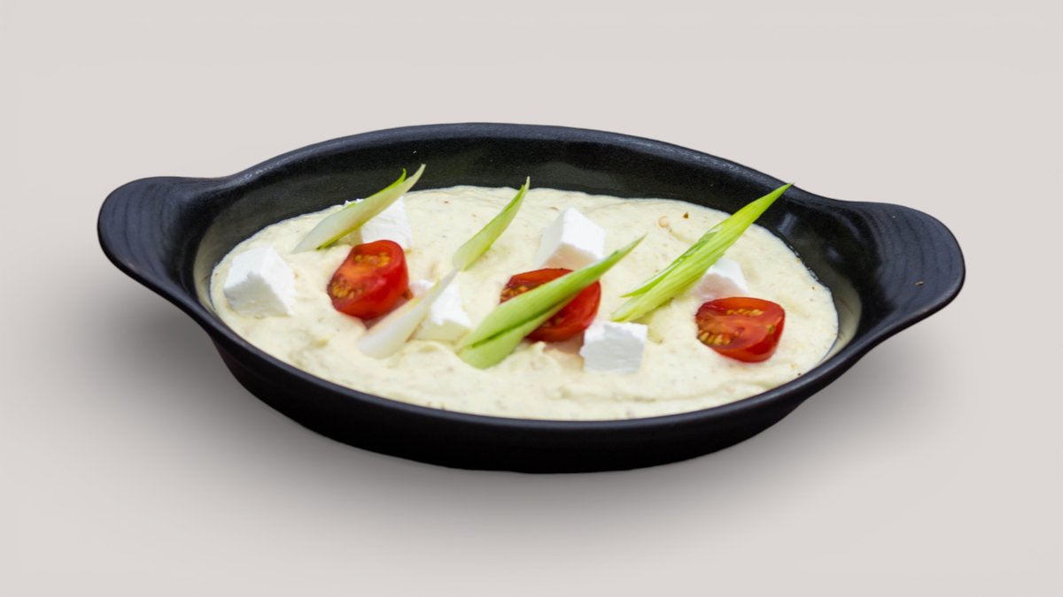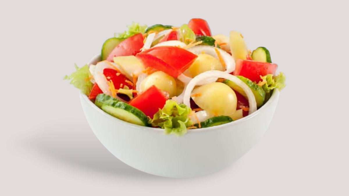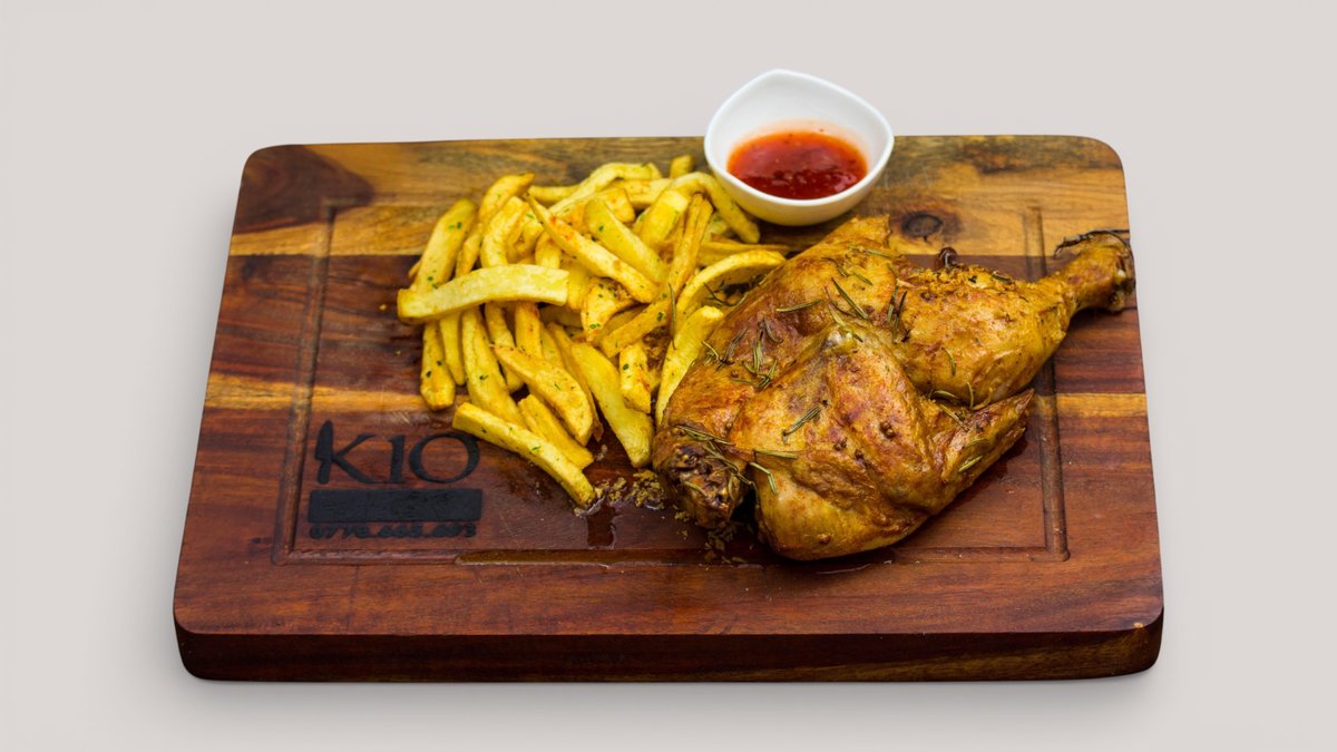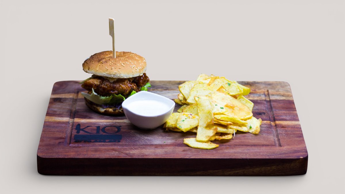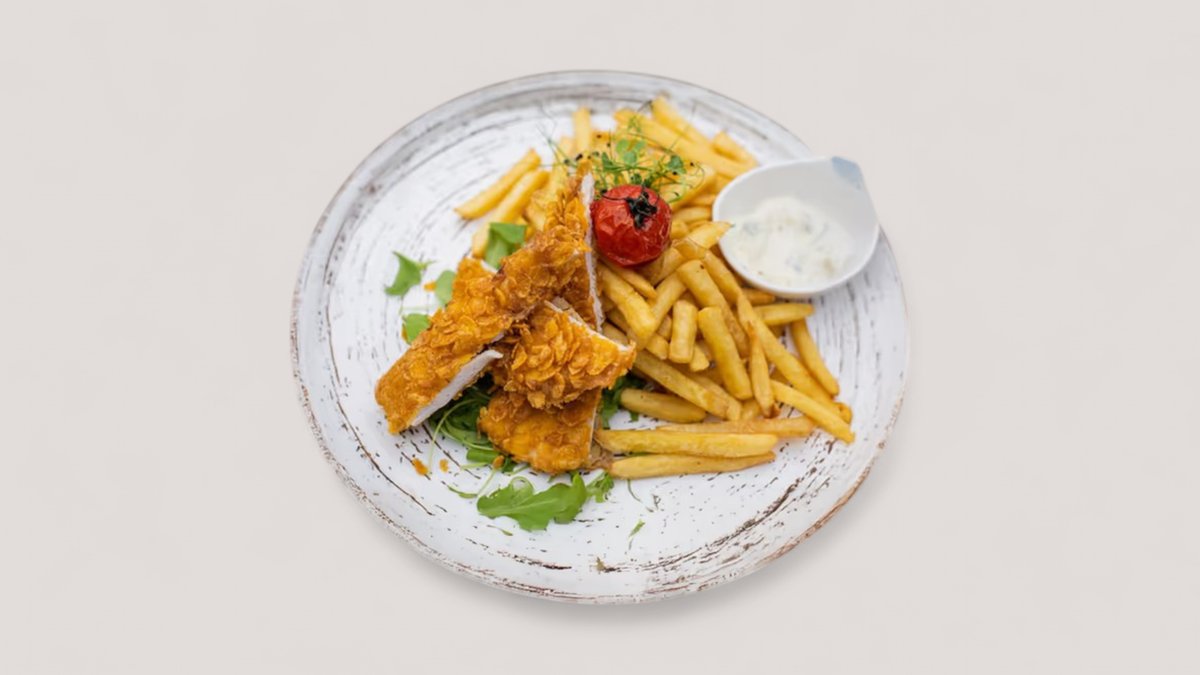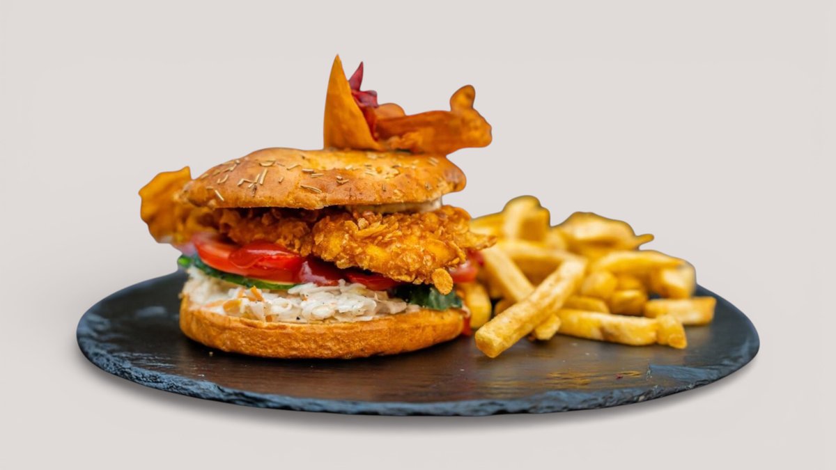 Chiflă, carne de pui, salată, roșii, cartofi prăjiți, castraveți proaspeți, sos tzatziki, ketchup, cipsuri de legume.