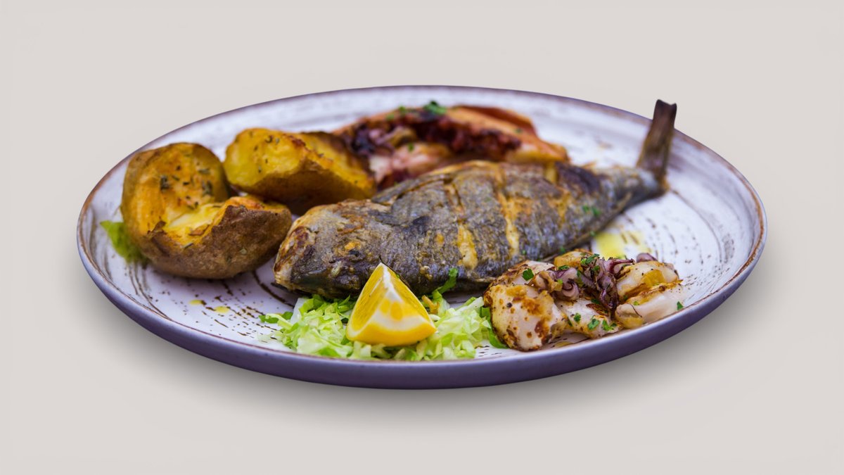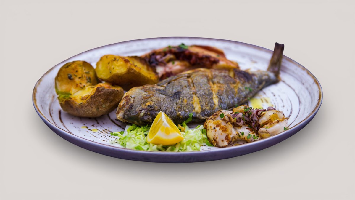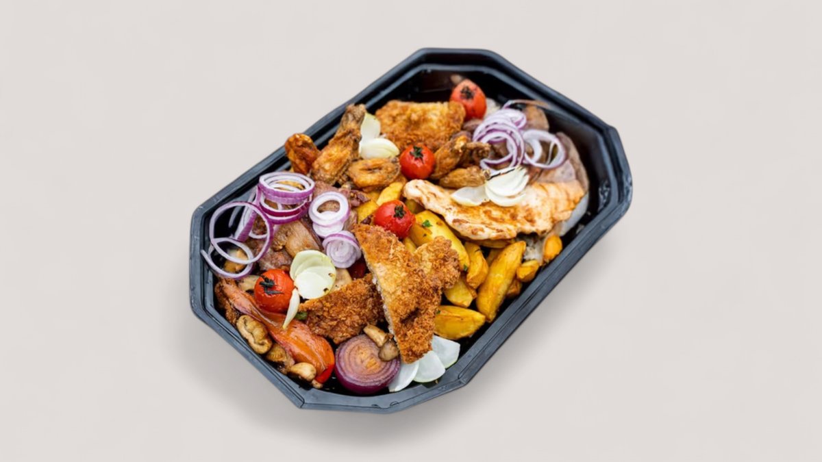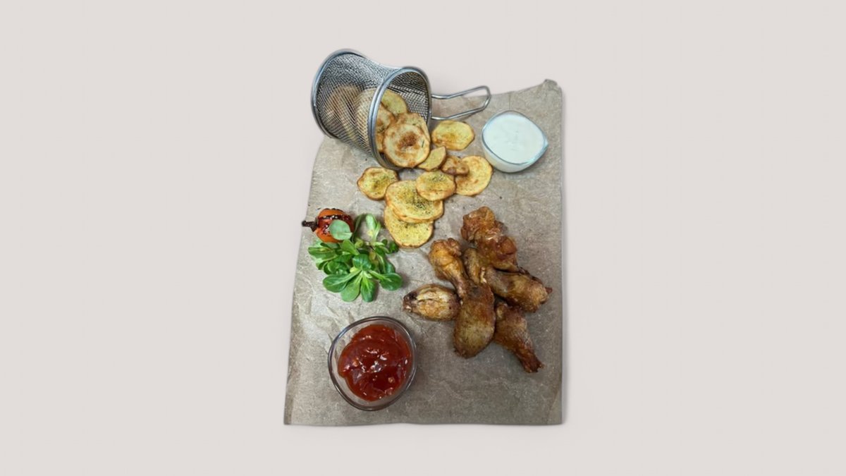 Aripioare de pui crocante, șnițel de porc, piept de pui pe jar, ceafă țigănească, cartofi copți, orez cu legume ratatouille 2000 g