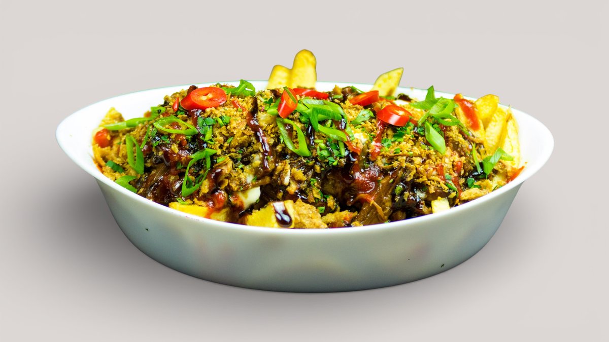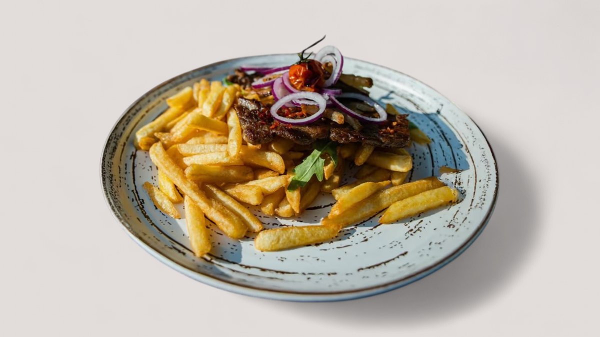 Cu cartofi prăjiţi, slănină crocantă şi sos de ardei iute 350 g