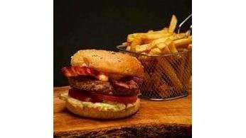 Burger, bacon crocant, maioneză, salată verde, roșii, ceapă roșie, sriracha mayo și chifla noastră .