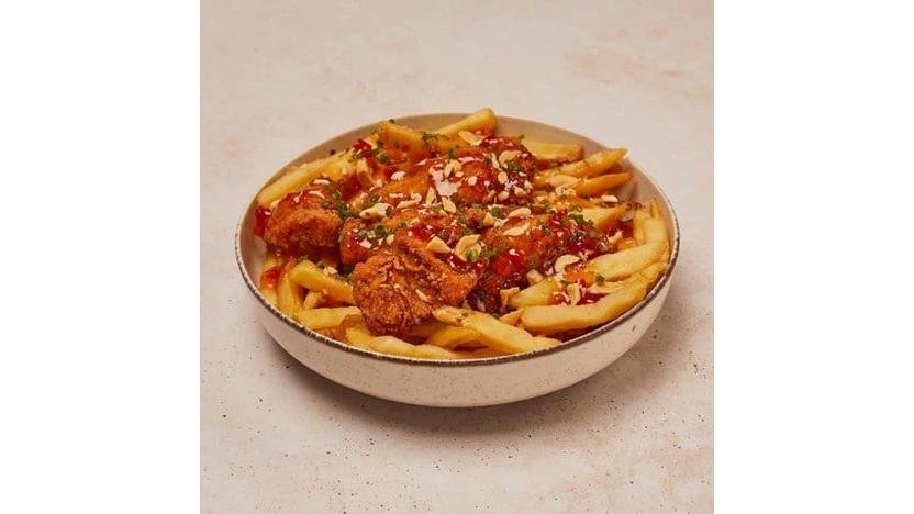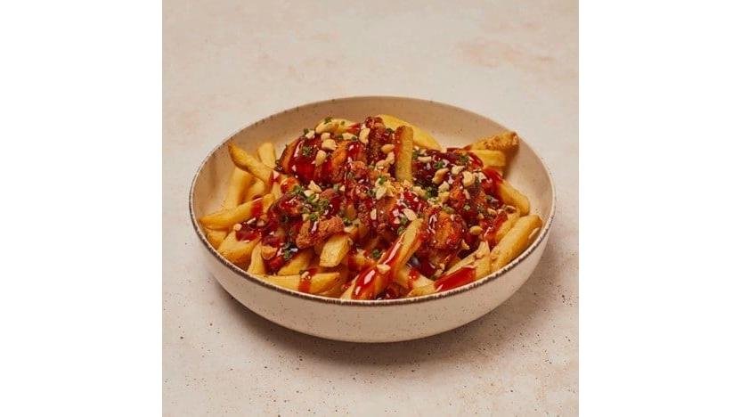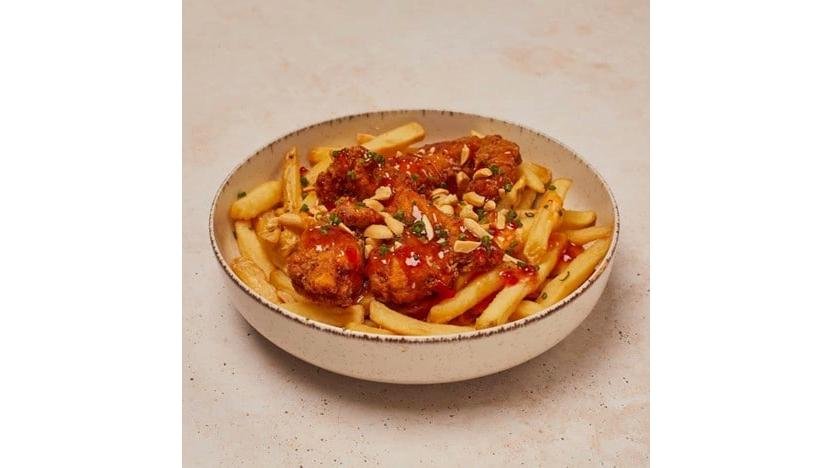 Crispy de pui și cartofi prăjiți în stil Thailandez. Porția conține crispy de pui și cartofi prăjiți, sos chilli, alune prăjite și chives tocat 400g