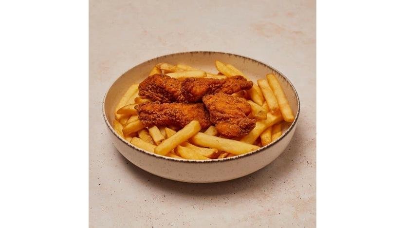 Meniu mare de crispy de pui cu cartofi prăjiți. Porția conține crispy de pui și cartofi prăjiți 500g