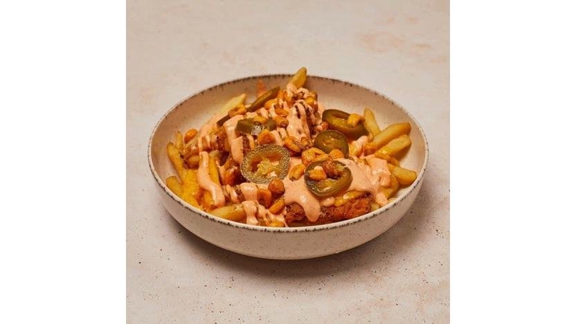Crispy de pui si cartofi prăjiți în stil mexican. Porția contine crispy de pui și cartofi prăjiți, maioneză picantă, jalapenos, boabe de porumb și cheddar topit 400g