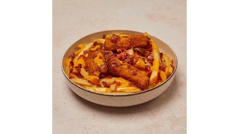 Meniu mare cu crispy de pui și cartofi prăjiți. Porția conține crispy de pui cu cartofi prăjiți, cheddar topit și bacon crocant 500g