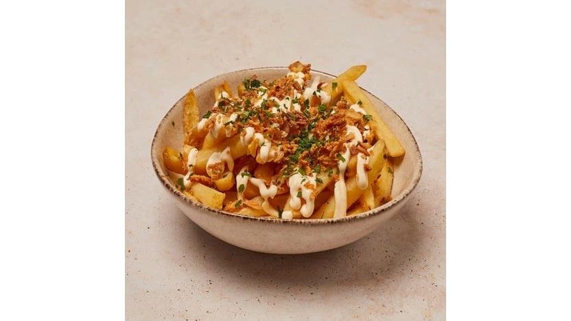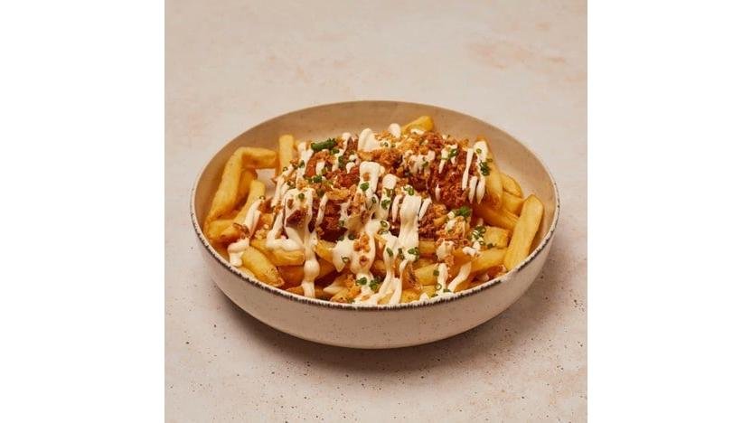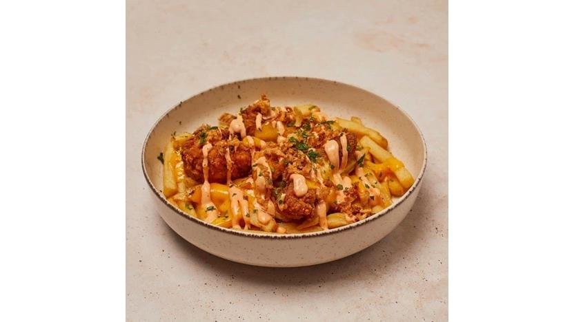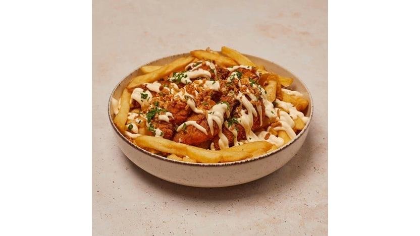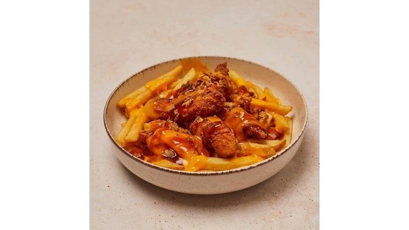 Crispy de pui și cartofi prăjiți cu sos picant. Porția conține crispy de pui și cartofi prăjiți, maioneză picantă, ceapă crocantă, cheddar topit și pătrunjel 400g