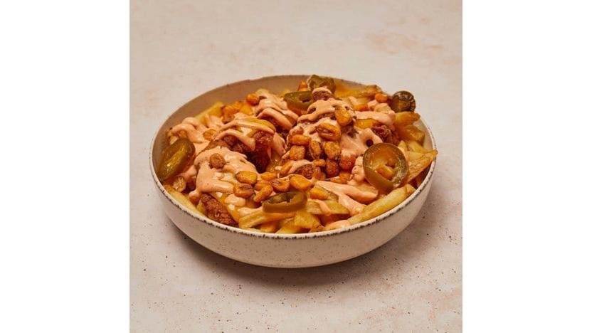 Meniu mare cu crispy de pui și cartofi prăjiți în stil mexican. Porția conține crispy de pui și cartofi prăjiți, maioneză picantă, jalapenos, boabe de porumb și cheddar topit 500g