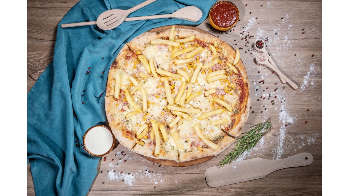 Blat pizza, cartofi prăjiți, piept de pui, șuncă, mozzarella, porumb, sos de roșii