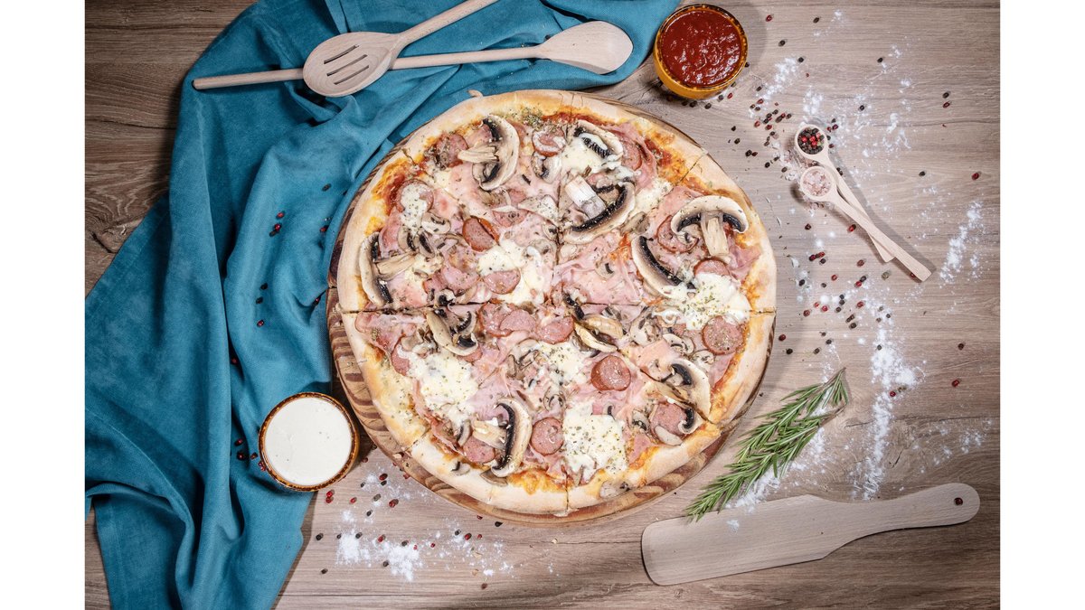 Blat pizza, șuncă, salam, bacon, mozzarella, ciuperci, măsline, sos de roșii