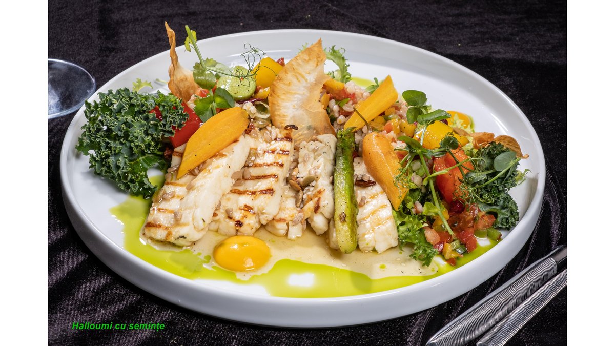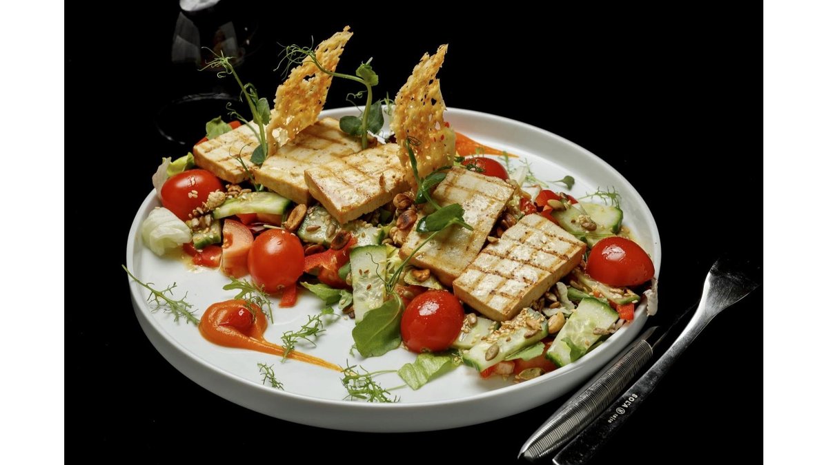 Salată mixtă, tofu, semințe, roșii, castraveţi