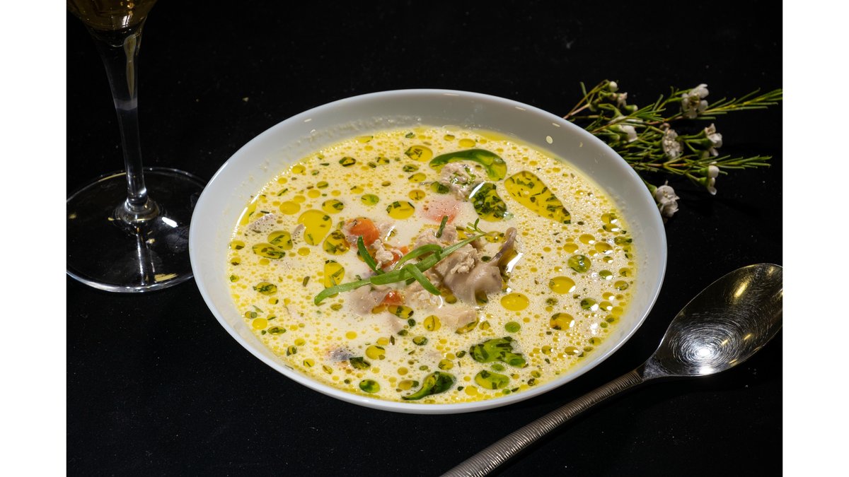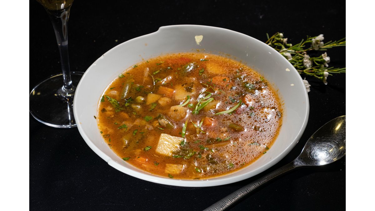 Cartofi, morcovi, țelină, mazărc, ceapă, fasole verde, conopidă, cremă de brânză, crutoane - 400 g