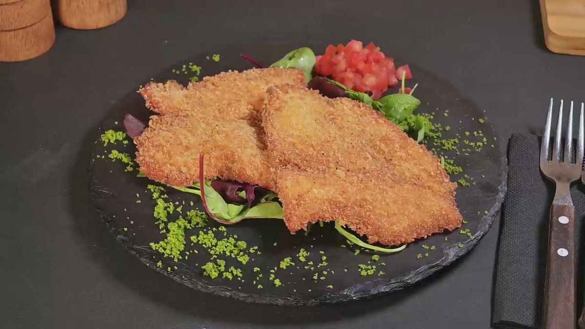 șnițel, cartofi prăjiți, murătură la alegere + sos la alegere 450 g