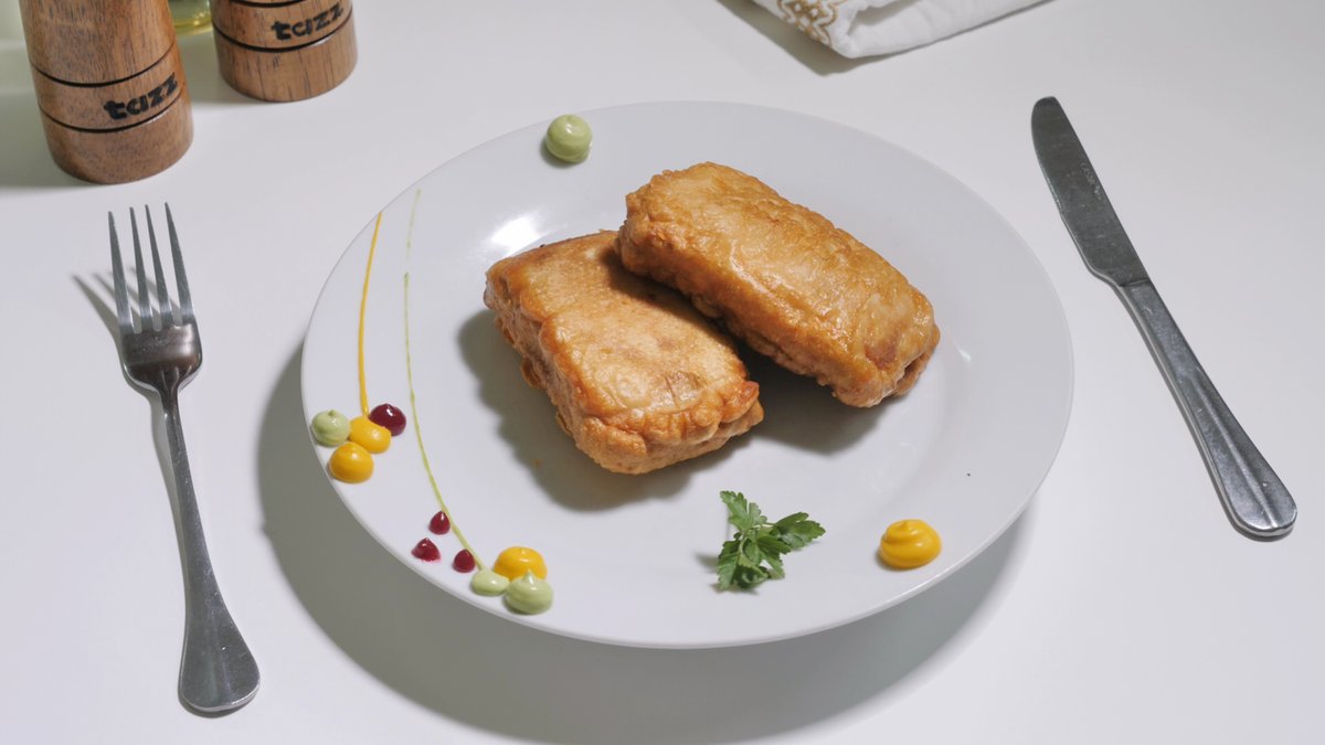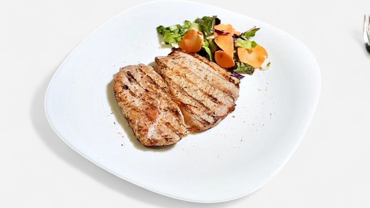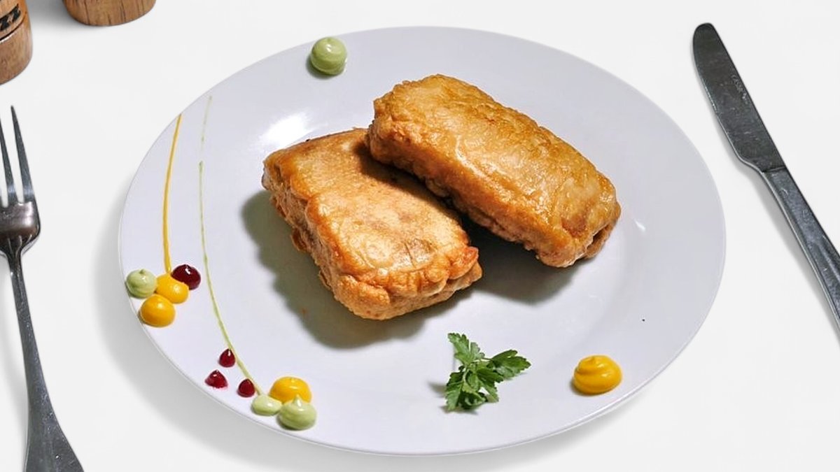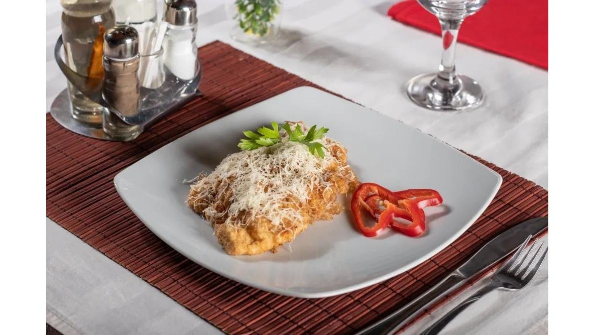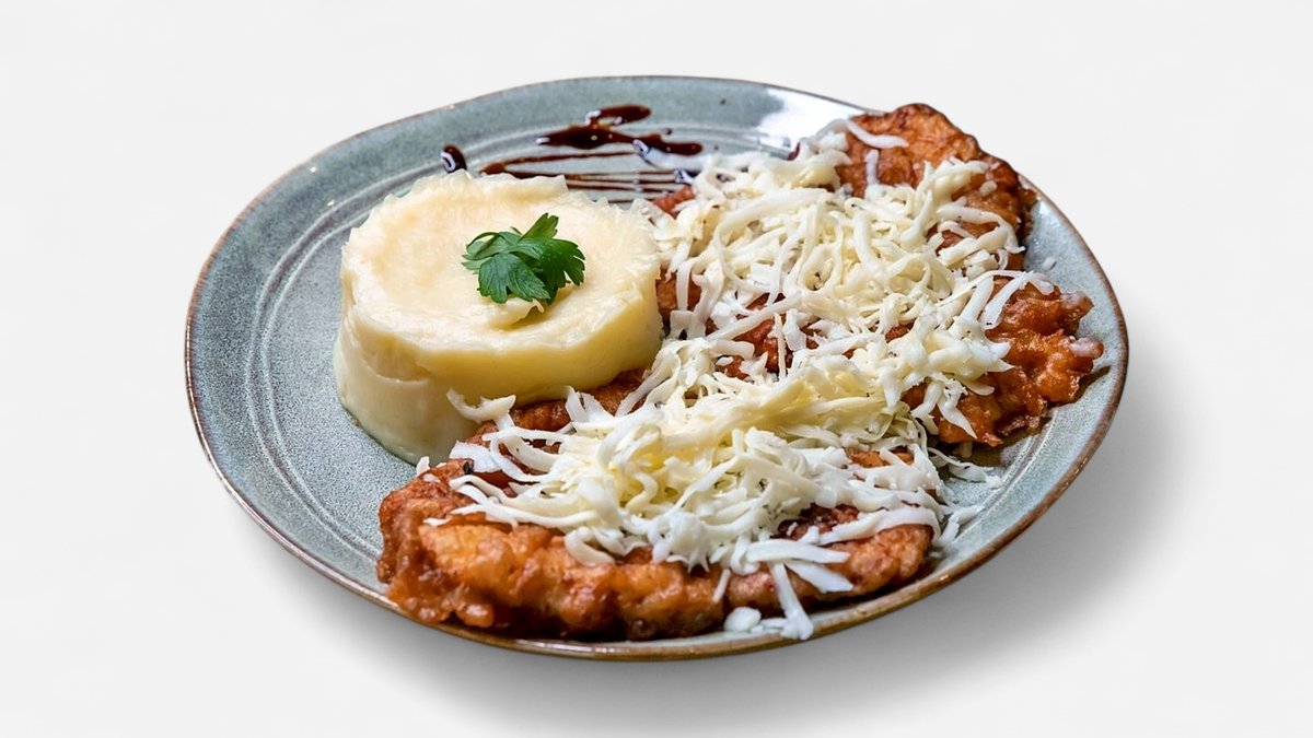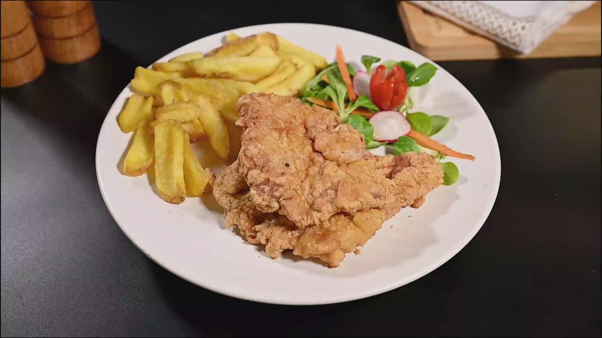 cotlet alb de porc condimentat, cașcaval ras, cartofi prăjiți, ochiuri simple 1 buc 400 g