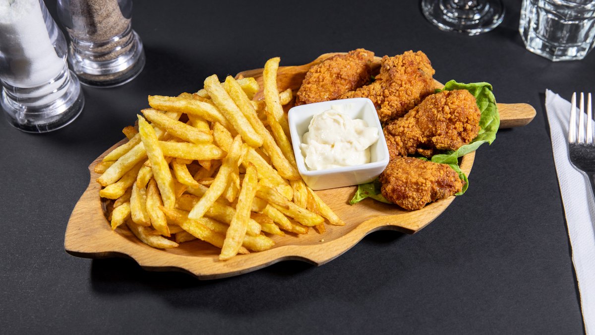 pui crispy, cartofi prăjiți, murătură la alegere + sos crispy 450 g