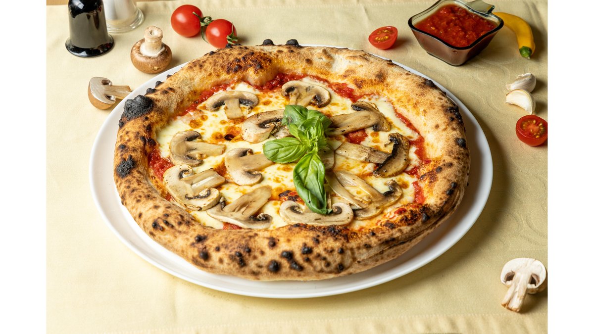 Blat 250 g, sos de roșii 60 g, mozzarella 100 g, șuncă praga 90 g, ciuperci proaspete 90 g 590 g