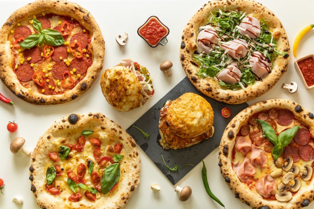 Blat 250 g, sos de roșii 60 g, mozzarella 100 g, șuncă praga 100 g, parmezan 20 g 530 g