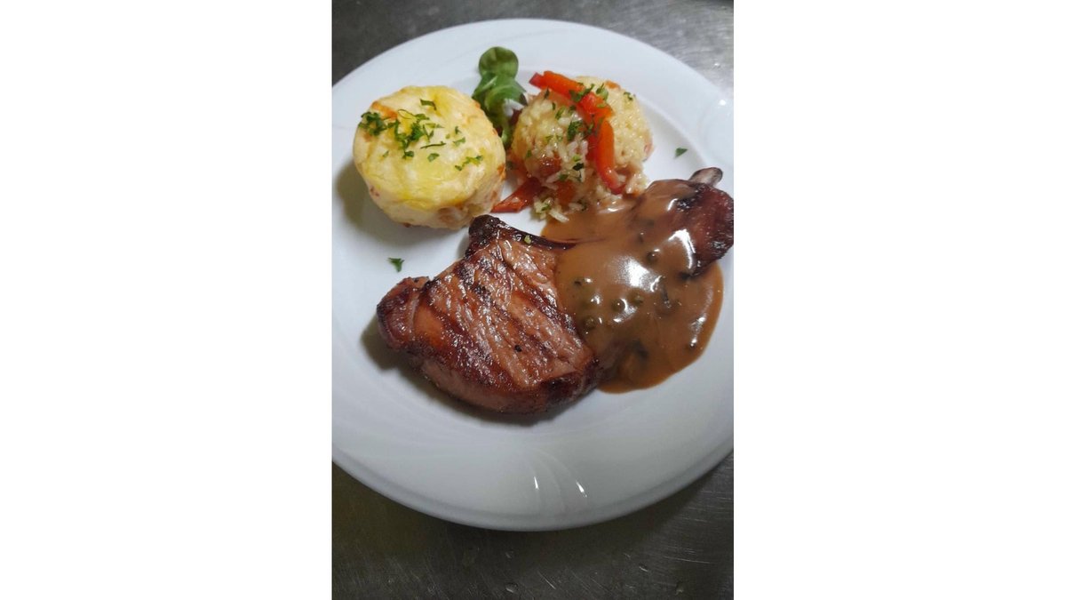Cotlet de porc afumat, ciuperci, sos de piper verde pudră, unt, Con Alexandrion 5*, pâine 150 g/50g